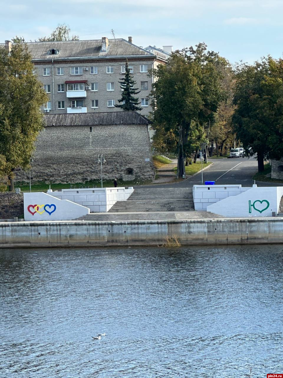 Вандалы нарисовали сердца на спуске к набережной реки Великой в Пскове, сообщили очевидцы Псковской Ленты Новостей.