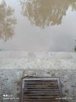 На набережной вода подняла люк ливневой канализации и фонтаном выливается наверх.