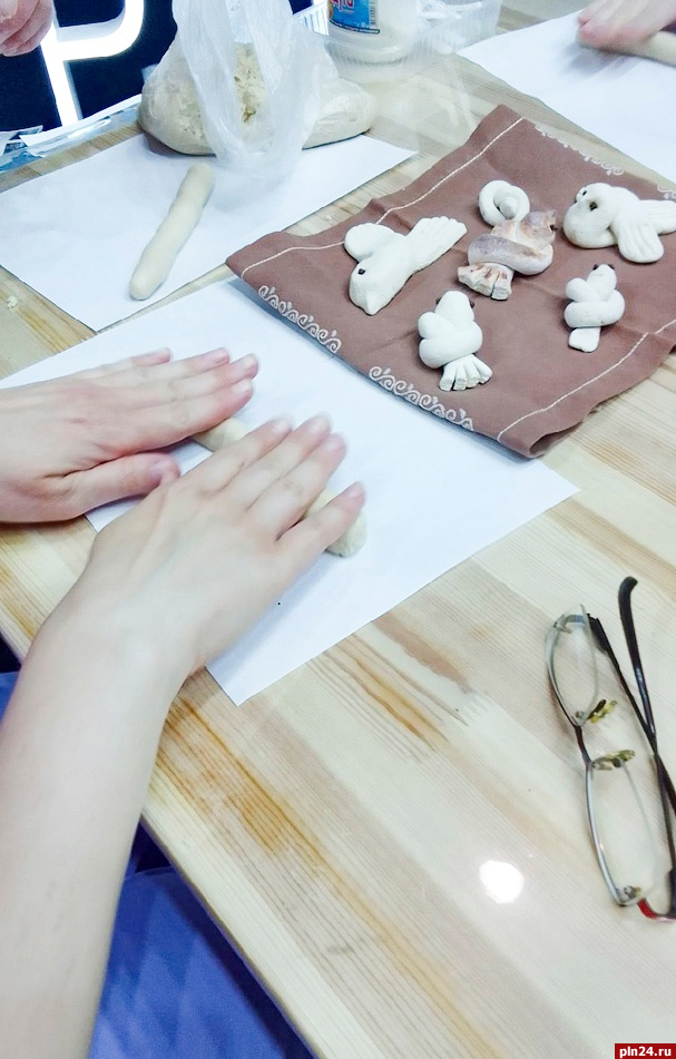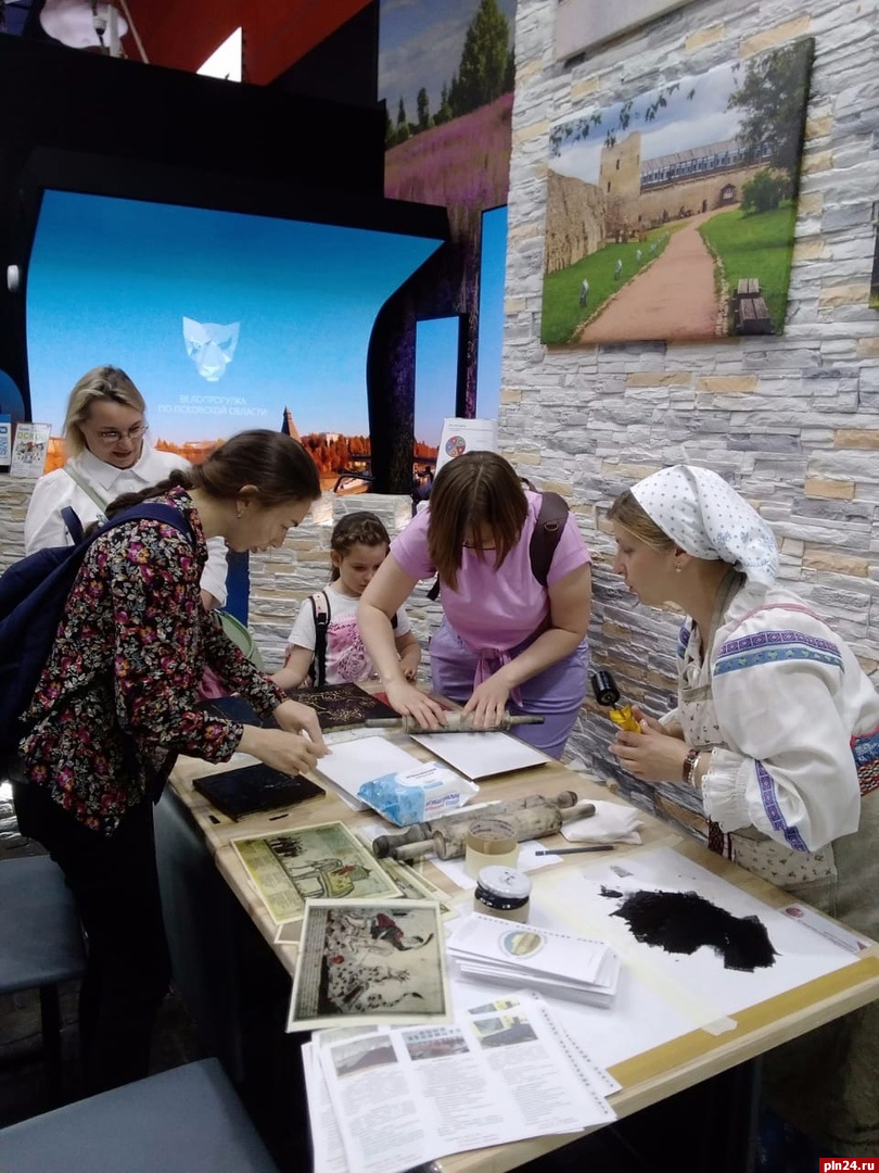 Елена Михайлова, заведующая сектором народных художественных промыслов Пушкинского заповедника, и Татьяна Трофимова, методист отдела просветительной и музейно-образовательной деятельности, в течение трёх дней проводили для гостей псковского стенда мастер-классы, разработанные в «Михайловском» в рамках большой образовательной программы «Народная культура». Всех желающих обучали плести традиционные псковские пояса («Ручное ткачество»), лепить из солёного теста фигурки-игрушки по мотивом сказок Пушкина («Хлебосол») и вручную делать оттиски лубков по образцам народной печатной графики из фондового собрания музея («Лубочные картинки»).