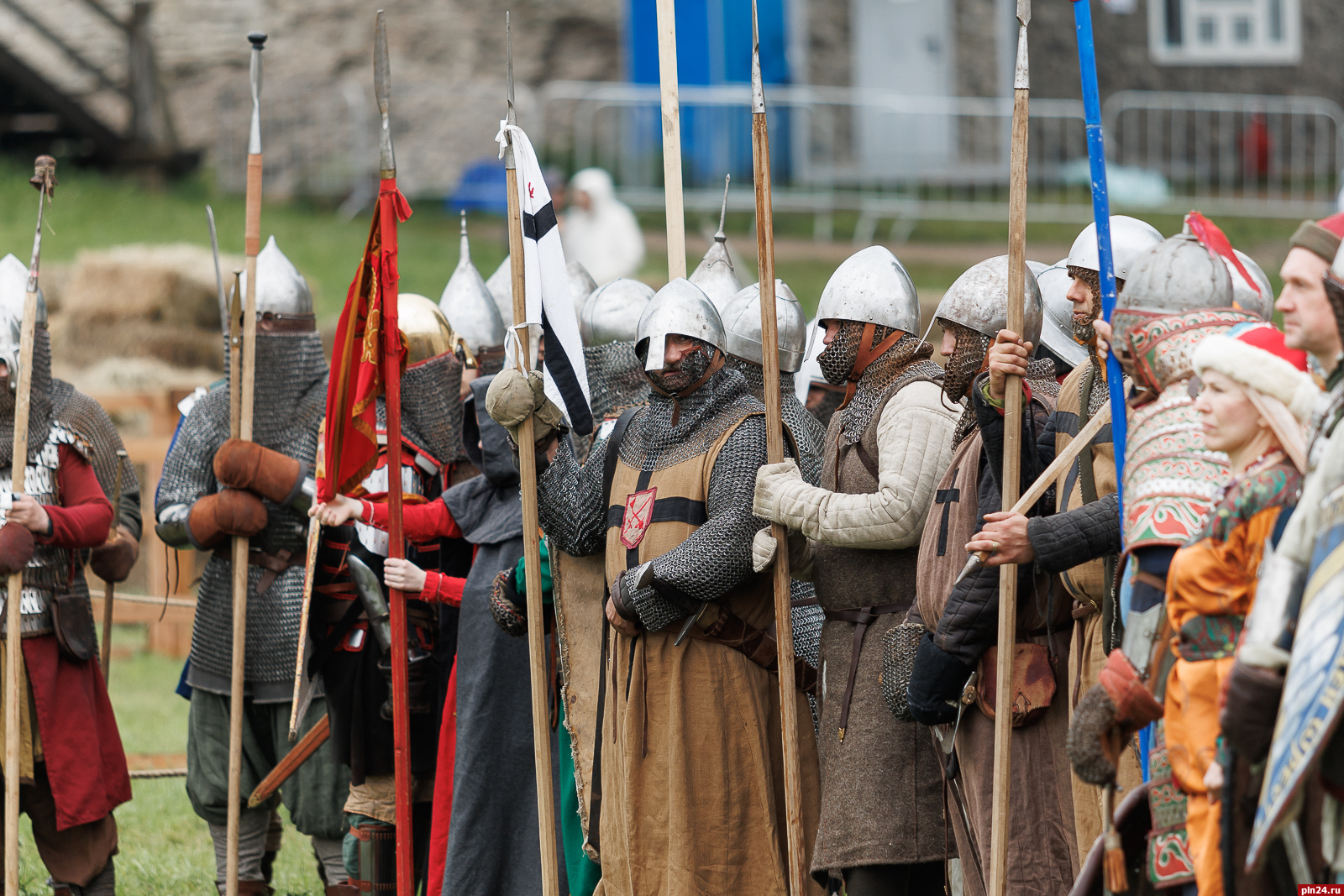 Также организаторы поблагодарили Псковский городской молодежный центр и информационных партнеров, в том числе — Псковскую Ленту Новостей. А праздник начался реконструкцией исторического сражения русских воинов и ливонских рыцарей.