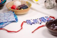 Участники проходят все этапы изготовления аутентичного женского украшения от формирования бусин из ткани, составления уникальной для каждой мастерицы композиции до декорирования готового изделия бисером, пуговицами, кружевом.