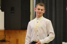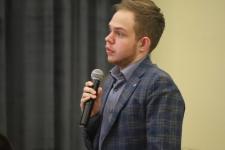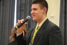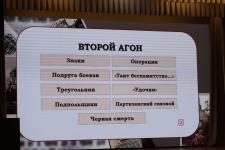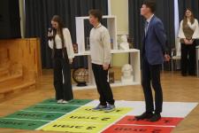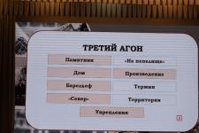 Школьники отвечают на вопросы олимпиады по теме «Непокоренная земля Псковская». По правилам игры участникам дана минута на размышления. Агонисты имеют право выбрать разные по цветам и уровням сложности дорожки. В случае их неверного ответа право голоса получают теоретики в зале. Многие участники уже получили ордена и медали. Среди них обладатель самых высоких баллов по результатам отборочных этапов Артём Николаев и десятиклассница Ксения Крылова.